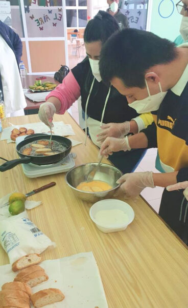 Con este taller trabajaron las actividades instrumentales de la vida diaria para el desarrollo de la autonomía personal. También se habló sobre los ingredientes que son más y menos saludables, a la vez que aprendimos qué es un plato típico.