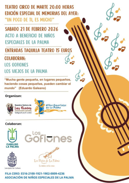 El Teatro Circo de Marte acogerá este sábado 21 de febrero el espectáculo solidario Un poco de ti, es mucho, una iniciativa impulsada por la Asociación Cultural Nuestra Señora de Las Nieves y apoyado por el Cabildo insular, que contará con la participación de Los Gofiones y Los Viejos de La Palma.